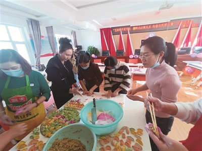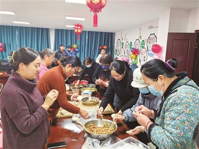 本报讯 (记者 郝梦媛 管晓静 谭丽) 室外阵阵寒意,昆仑路街道建兴巷社区活动室里却是一片热气腾腾、欢声笑语。社区工作人员和居民围在一起包饺子、唠家常,现场热闹非凡。大家三五一组、分工明确,切菜、拌馅、和面……大家互相切磋手艺,时不时交流包饺子的“独家秘籍”,个个动作娴熟,忙得不亦乐乎。不一会儿工夫,薄薄的饺子皮就被填满成了“胖元宝”,各种颜色的饺子装了一盘又一盘,一双双灵巧的手把浓浓节日情包进了圆鼓鼓的饺子里。