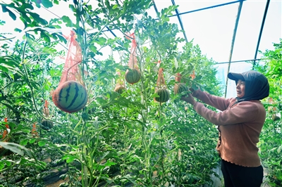 图为工作人员正在大棚里查看无公害西瓜的长势。