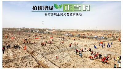 4月16日,我市机关企事业单位3000余名干部职工在滨河路义务植树基地参加义务植树活动,植树110亩,近2万株。 记者 冯春梓 摄