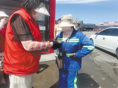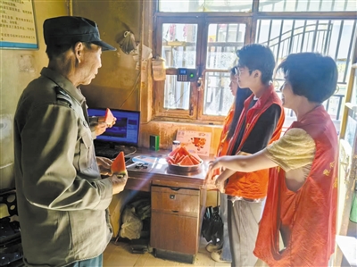 工作人员为环卫工人、辖区高龄老人、独居人士、户外作业人员等群体送绿豆汤、西瓜等解暑用品。