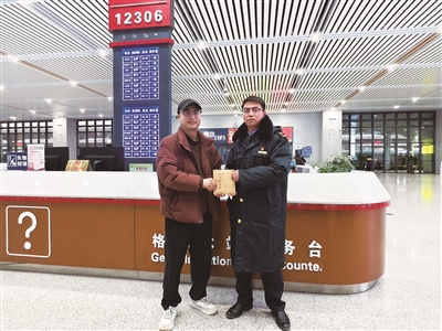 1月24日,旅客谢建功乘坐C893次列车到达格尔木站后,来到“昆仑驿站”服务台办理遗失物品领取手续,值班干部高阳严格按照流程,对旅客身份证信息进行反复核对,确认身份无误后,从保险柜中取出档案袋交予旅客。在工作人员的见证下,旅客现场清点了现金。