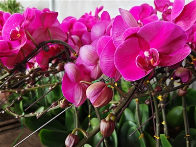 在小岛社区附近的刘家花卉大棚内,暖意融融、花香四溢。红粉相间、纯白、黄斑及马卡龙色系等多个品种的蝴蝶兰整齐陈列,花瓣宛如翩跹蝶翼,将大棚装点成五彩斑斓的花海。大棚老板刘鸿华正忙着为顾客现场组合盆栽,选花、配草、固定、装饰一系列动作娴熟流畅,片刻间便完成一盆株型饱满、搭配精巧的组合盆栽,成为市民新春购花的“心头好”。